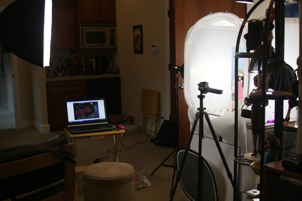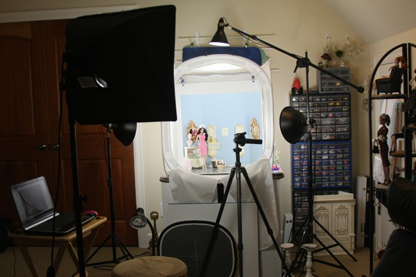 I always love it when fellow collectors and photographers share some of their behind the scenes photos. I always find it extremely helpful to see what other people do as far as styling and photographing their collection. I thought I would do the same and share what my set up looks like when I do a fashion doll shoot. Keep in mind that I live in the Pacific Northwest which means there is little to no light from November through July