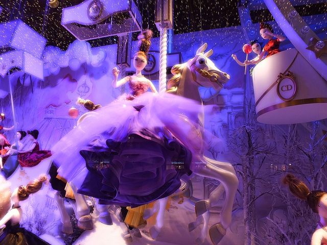 I was perusing new additions from my favorite Flickr photostreams recently and a series of photos completely caught my eye. NylonBleu has long been a favorite of mine on Flickr. Her photos are romantic homages to the art form of doll photography. Her photos for me always evoke grace, style and a true love for fashion and fashion doll collecting…it shows in each and every photo she posts. Last week, she shared photos on her Flickr of the unveiling of Printemps’ holiday windows in Paris. Dior designed the windows this year and the only words that come close to describing my reaction is awe inspiring. I don’t know the scale of these dolls…but the pure inspirational artistry and design of these windows has me frantically searching for a 1/6 carousel horse for a future photo shoot .