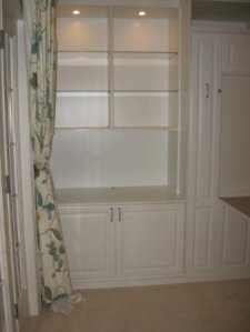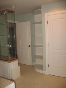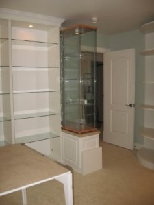 A very long list right. So I decided to call a professional for help. I worked with Pacific Wallbeds Northwest to design a system of shelving and wallbed that would meet the needs of the list above. They were able to accomodate each and every one and made the process so enjoyable along the way. They came in on budget and one time – a match made in heaven. Their team even put in extra items that I had not thought of. There is a large corner in the room when you come in the door and the designer with WBNW suggested a radius cabinet to maximize display space. I had a couple of IKEA display cases that I wanted to use in the room and the designer suggested we set them up on cabinets so you could see the displays better and that offered storage underneath – brilliant!. Here is how it turned out.