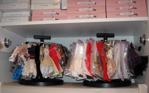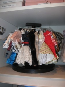 The rounds of clothing are great because you can just pick up the whole round and take it out to look for what you want. They take up a great deal of space however. The drawers are full of various items like, purses, furs, gloves, glasses ect…