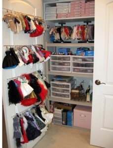 The latest in organizing clothing on the back of the doors of the closet. Shorter dresses and suits are above and longer gowns are below. I am now using paper cardstock dress forms to hang the clothing on as it helps keep the clothing neat and the cardstock form is more compact than the plastic variety so I am able to store more clothing on each rod.