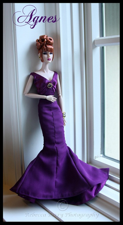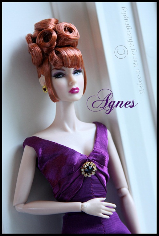 Many collectors panned this Agnes at convention. I suppose her hair was not what everyone was expecting. On one of the doll boards the hair was compared to Endora of Bewitched….ouch! When I first removed her from the box, I could see what some were saying. The curls did sit a bit too high on her head. I decided to try and tame it down some and I like the end result. I love me a high updo and you add red hair and curls to this and I’m a happy camper. I LOVE her. Oh and added bonus…the gown is purple…my daughters favorite color. ![]()