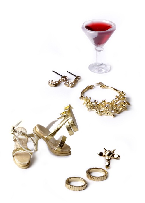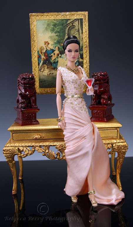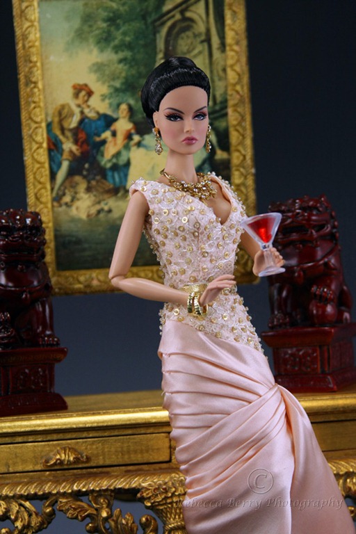 I knew when I first saw photos of this lady that she was something that would fit right in with my collection. I have eagerly anticipated this first club doll offering from the W Club for 2011. She arrived this past week and I have to say….the promo photos did not even come close to doing this lovely lady justice. This lady harkens back to the high glamour days of Fashion Royalty’s earlier collections. She just drips style and elegance. I hope my photos are able to convey this. Her jewelry is gorgeous and extremely well made. I love the chunky necklace. There is an additional bracelet that came with the set but I didn’t feel she needed it ( It is sure nice to have extra though ). I love the fact that she came with her own cocktail..I keep wanting to remind her though “ don’t spill that on your gorgeous gown…I mean that’s cranberry juice in there and that is peach silk you are wearing…Danger!”.