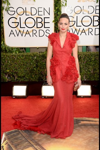 Bérénice Bejo in Giambattista Valli. I am sure this looked stunning on the 6 foot model who wore it on the 2013 fall couture runway. Here it just had me imagining this conversation “Honey, who cut up the red bath matt from the guest bath?” WAY too many poufy things on this one.