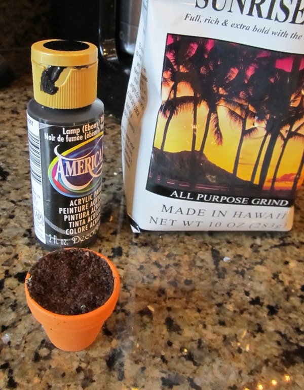 I found the little clay pots at my favorite garden store but I think you can get them at Michaels or JoAnne’s as well. Tangential thought…are all craft stores someone’s name?…Michael, JoAnne, Ben Franklin…Anyone know? Anywhooo…onward… Take your pot, fill it with something to hold the flowers. I use florist wet oasis/ foam because it is easy to cut and it molds to any shape. I usually have it on hand to do floral arrangements but you can use whatever you have on hand. Many people use clay as well. I cover the foam with black paint and while the paint is still wet, I sprinkle coffee grounds on the foam allow it to adhere then shake off excess. Yes, this floral arrangement will smell like coffee for a while. You can use loose packed tea as well for a different look and smell. You may need to send the tea leaves through a sifter to get them to a small enough scale.
