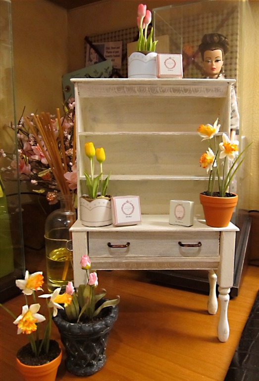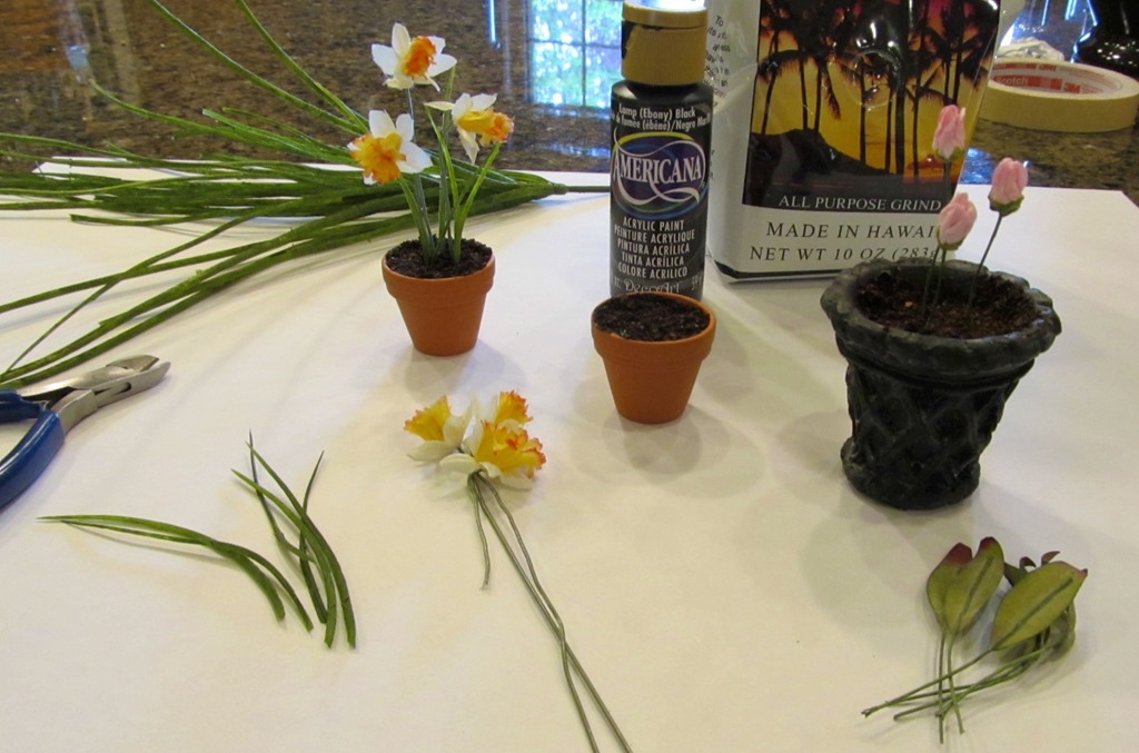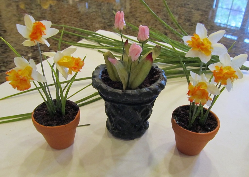I cut pieces off of a random piece of greenery I had purchased at a craft store for the daffodils. For the tulips, I used leaves I had purchased at a craft store ( usually in the wedding section with boutonniere supplies). The pink paper tulips were sent to me by a friend from Holland ( love ya!) and the daffodils are another story. They are fabric flowers and not paper. I found them in a bundle at Ben Franklins(yet another craft store named after a person) about a year ago. Originally, the orange part was a full flower. I decided to sew the flower closed to get a trumpet and voila!…daffodil. I think it was just plain luck that it was in the right scale.