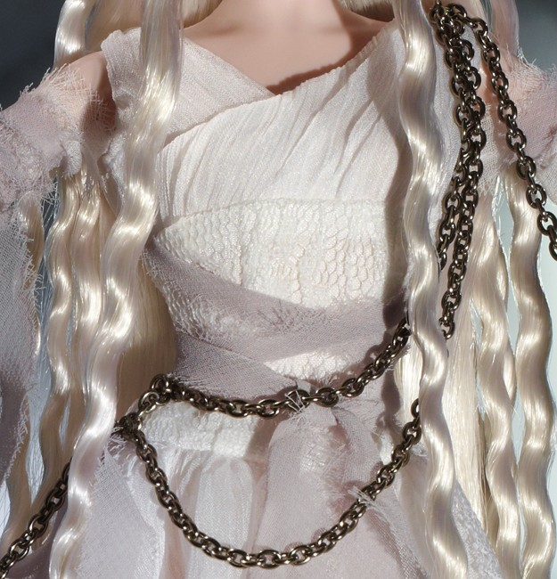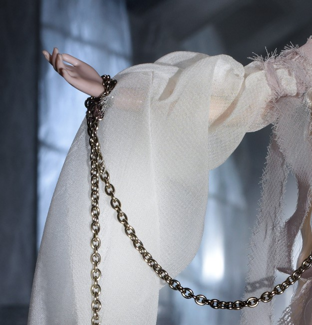 Haunted Beauty Ghost™ Barbie® wears an ethereal, off-white gown featuring fitted bodice, bell sleeves, and full skirt with tattered hem. A silvery earthly chain wraps around her body. Her long, pale platinum hair and dramatic face paint take her far beyond the paranormal to extraordinary!” —From Barbiecollector.com