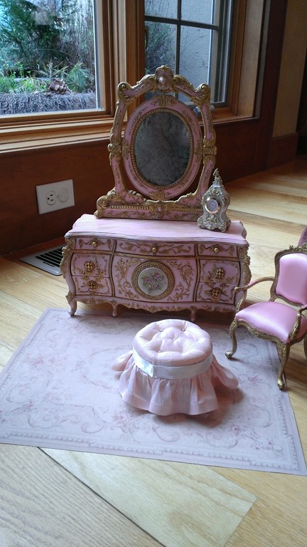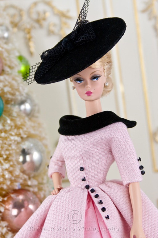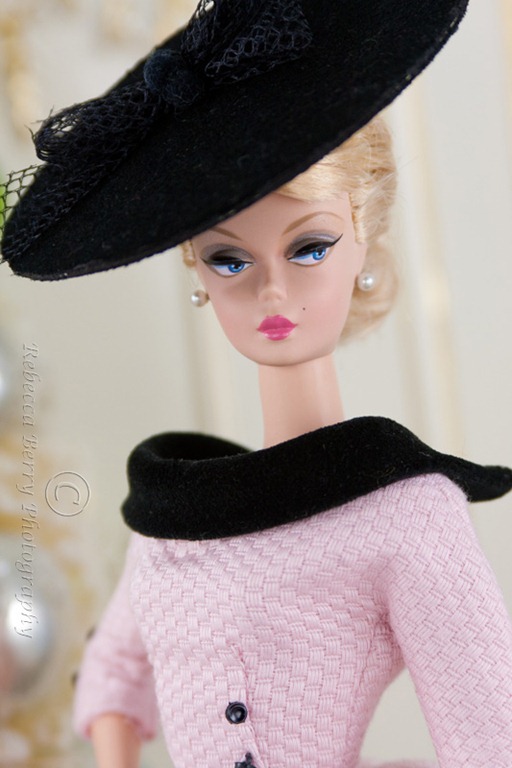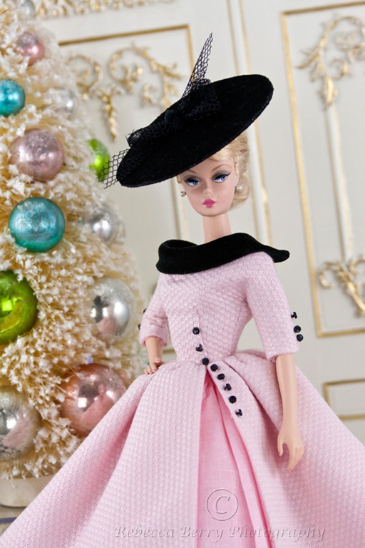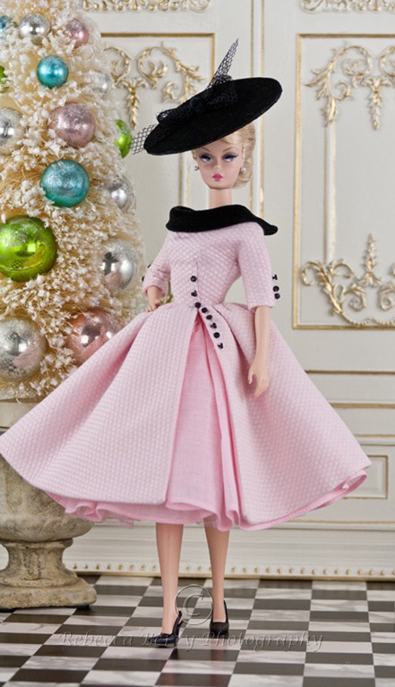Preferably pink refers to the doll in this photo but it really could be the gown as well. This was perhaps my favorite Bogue’s Vogues purchase of the year though choosing a favorite Bogue’s Vogue is like choosing my favorite child between my two kids….impossible. This delicious pink cotton pique number with rolled black velvet collar is paired with a black velvet hat with netting bow. TO DIE FOR! Once again Mr Bogue…that hat is off to you. Ms. Preferably Pink has had her hair restyled at the salon de Berry.