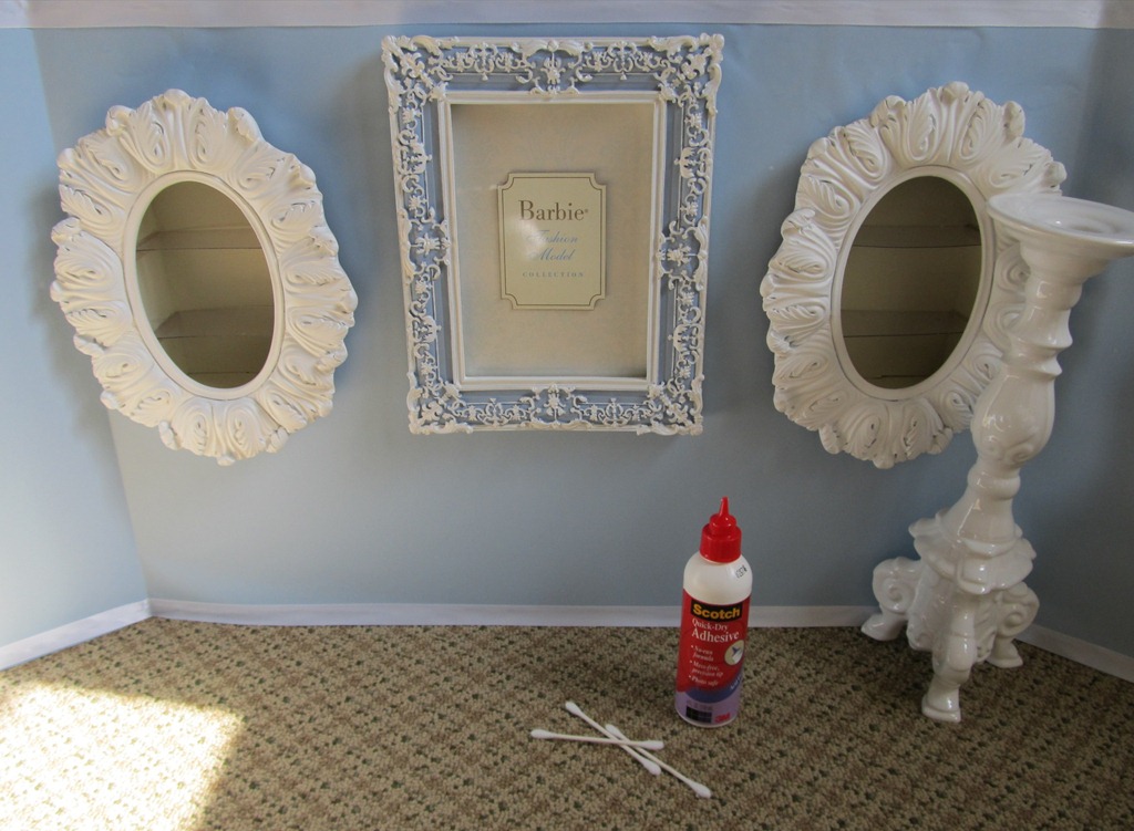 Let the repairs begin! I decided to swab behind the paper gaps with adhesive and see how it went. It’s not as smooth as the spray adhesive but…it may do. I shored up the heavy plaster frame with an equally heavy candlestick while it dried.