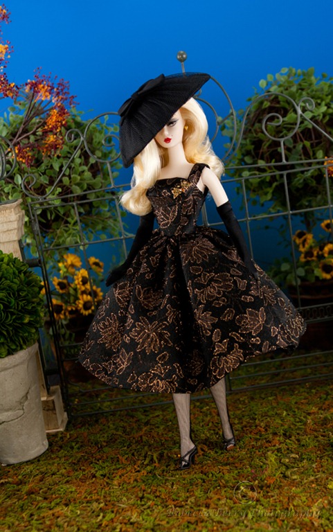 All good things must come to an end. Or…in my case…all sunny days in the garden eventually give way to rain. I managed to get three separate photo shoots completed before the rain started so I am happy with that. For the last installment of this romantic garden series I paired a favorite embroidered sheath from Bellissima Couture and a yummier than yummy coat from Lovetones. The hat is a story. It originally came from Bogue’s Vogues and I have to admit…I got creative with the Russian netting on this one. Hope you all enjoy.
