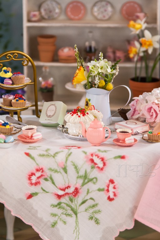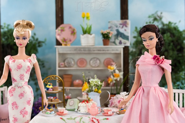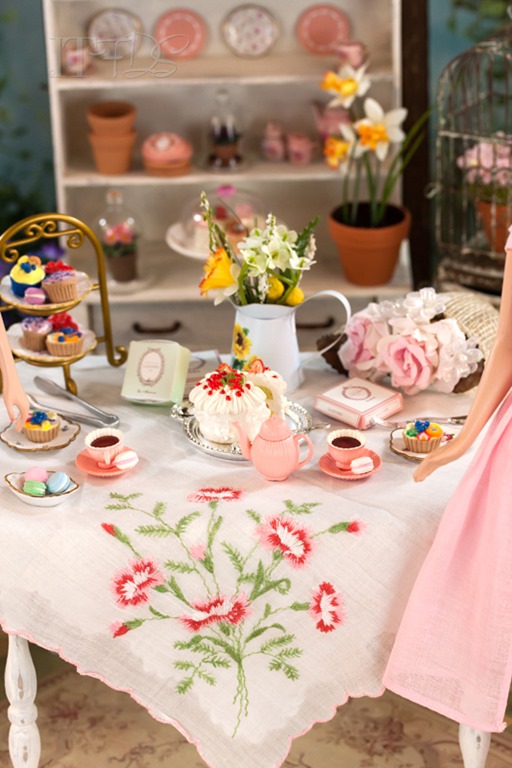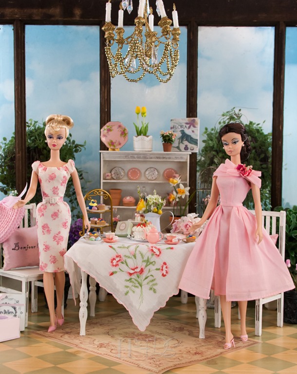 I really should have released this blog post at around 3 or 4 PMish for tea time right? I have been saving these photos for a couple weeks to share here because I knew I would be tied up with dance recital photos this week and too busy to do anything in the doll studio. I had WAY too much fun with the conservatory diorama and decided to set up afternoon tea for a couple of Silkies. I hope you enjoy.