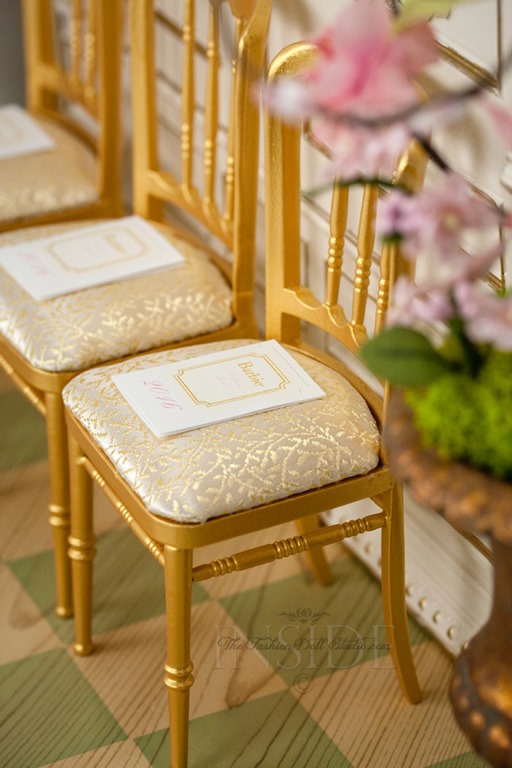 Gold chairs were custom ordered from China. You can find more like them here. Frankly though, you should just get ahold of some Barbie Fan Club chairs from this year and spray paint them gold…it would be cheaper.