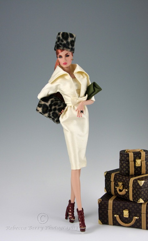 I love the versatility of James Bogue’s creations. Normally I head straight for the Silkstones to find a model for his designs but the smaller bodied Fashion Royalty girls can fit into them very well also. I especially like the F.R. squared line and here we find Modern Sensibility Dasha modeling a cream silk dress and jacket with a leopard hat and muff. Let’s be honest…there was a hat involved here and I LOVE animal print accessories so the second I saw the leopard print hat…it was “game over”. James was a wonderful friend to make a matching muff for me.
