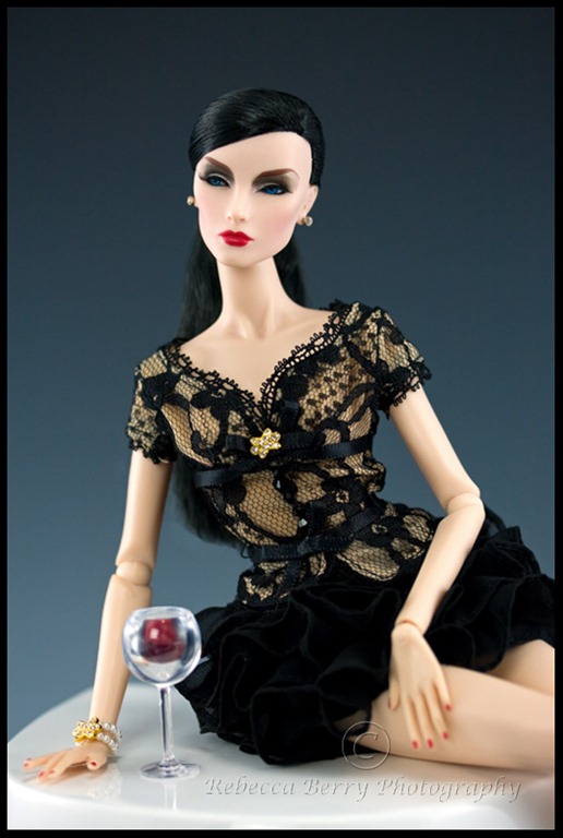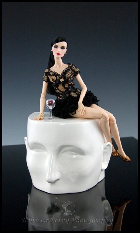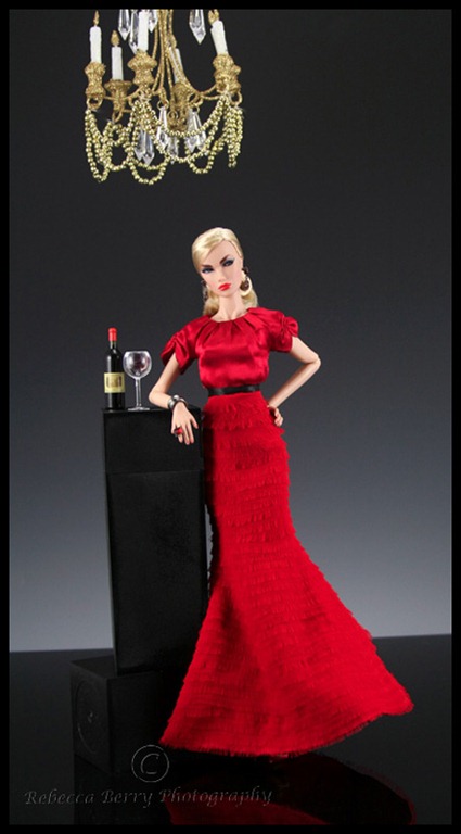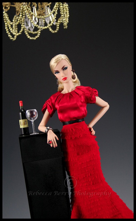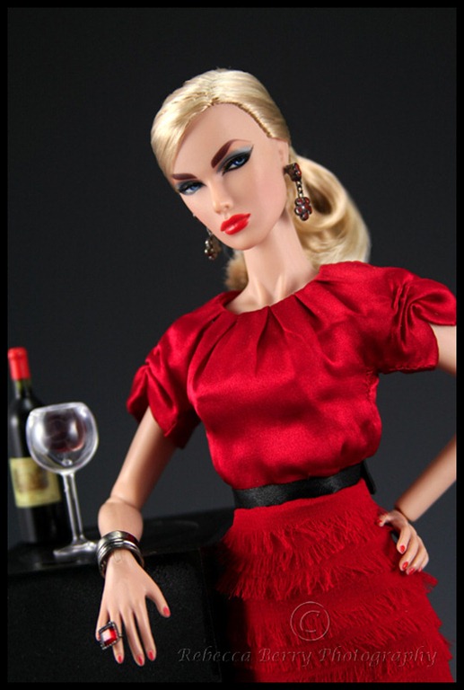 I did not win the right to purchase this lovely lady in the lottery but thanks to a fellow collector and a fabulous trade, Renegade Dasha is in the house! I really love the styling of this particular FR Squared Dasha. She is very sophisticated and sleek. Yes, the half bun half ponytail hairstyle is a bit of a mystery but it is fairly easy to work around. I really like the blond hair, pale skin and red, red lips. She seemed to me like she needed a sleek and sophisticated backdrop so I imagined her at a swanky wine bar with a lovely merlot. We live in wine country so I will use wine many times for my props.