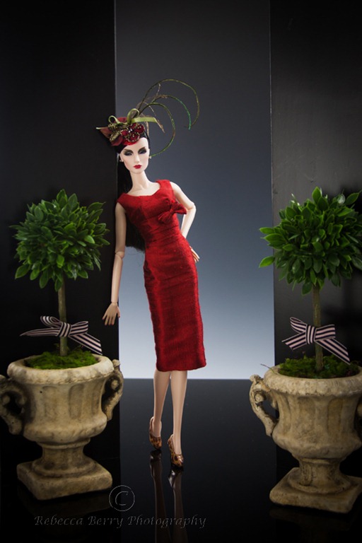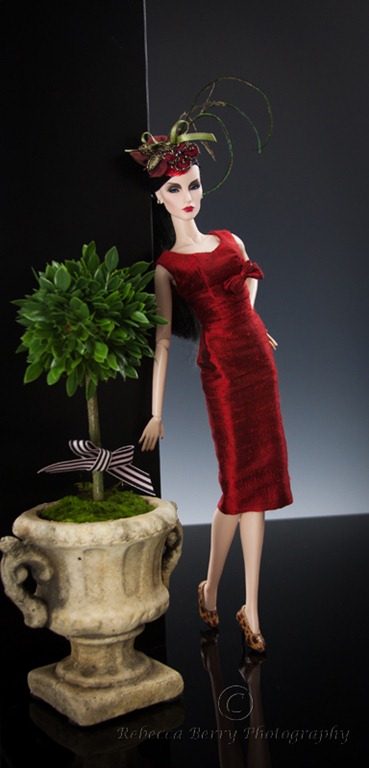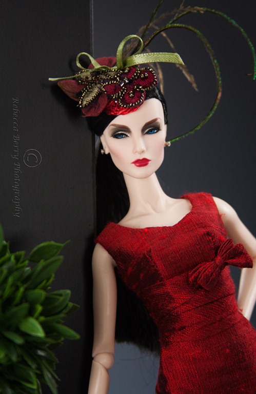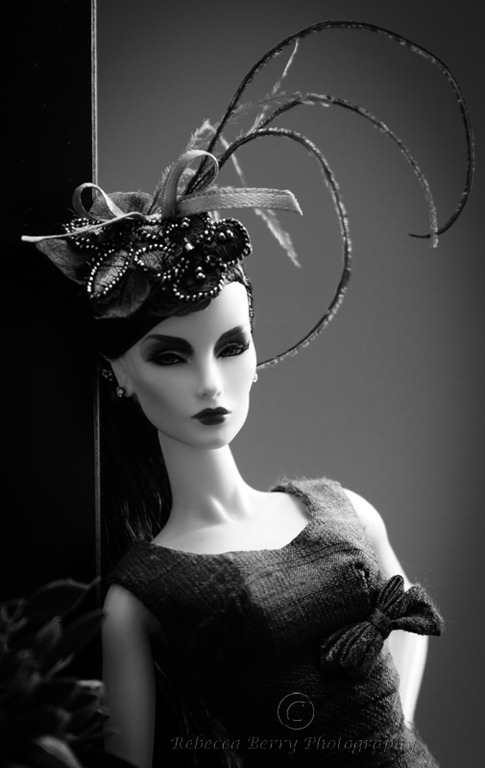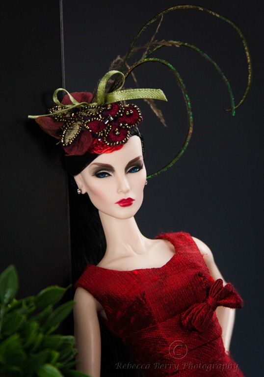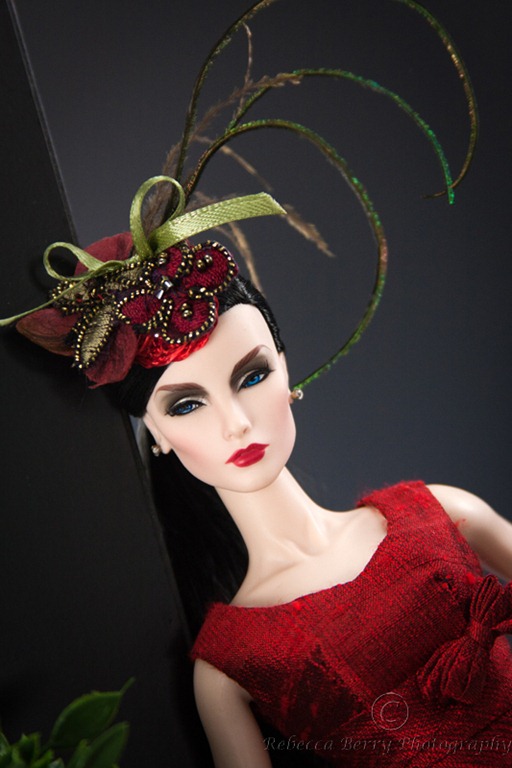A change of models, couture and hats. I have had this hat for a year and on this model for almost as long but just have not gotten around to photographing her…bad me. I am a big fan of the Integrity Toys FR2 Fashion Royalty line. The high couture slimmer articulated body makes for great poseability. I just wish their feet were the same size as the others…it can be a bit of a pain to find the right pair of shoes because the choices are limited. Integrity Toys is trying, in my opinion, to make up for that a bit by gifting us with some amazing shoe sets at their convention every year. Now, if they could make a shoe set available to the WClub each year {hint, hint}, that would be fantastic!