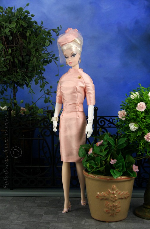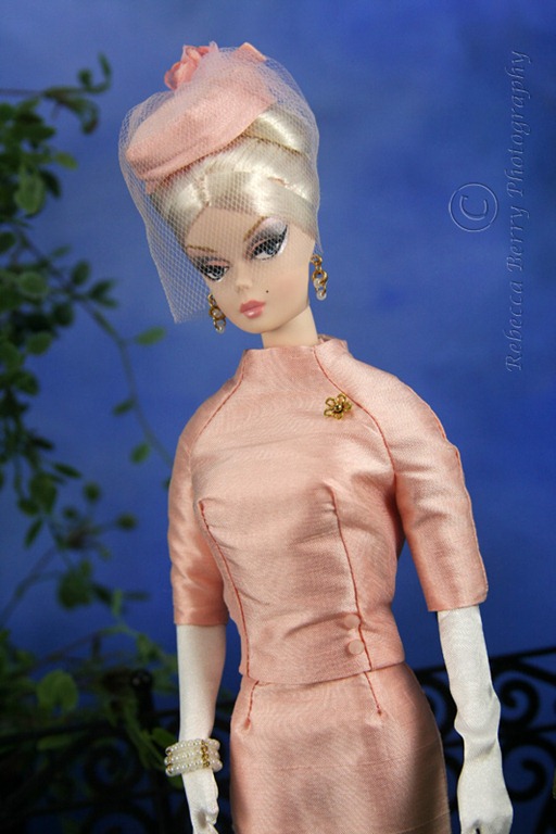 Miss “The Happening” Poppy Parker is wearing a Mattise outfit with matching hat and clutch. Shoes are by Mattel. The faux fur wrap is also by Mattise and Poppy’s pearl earrings were borrowed from a sister Poppy whose name escapes me at this time.