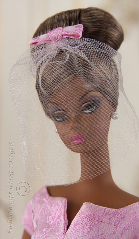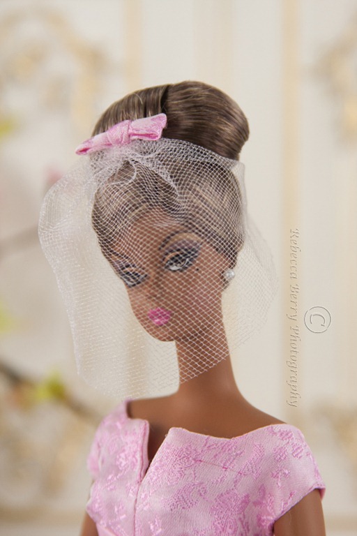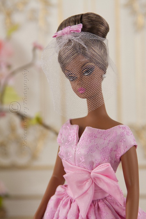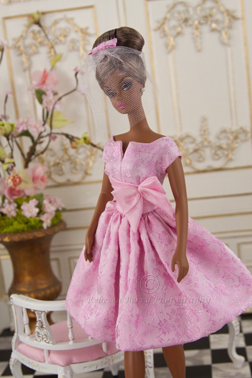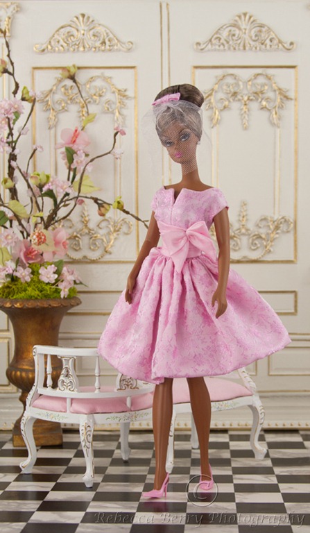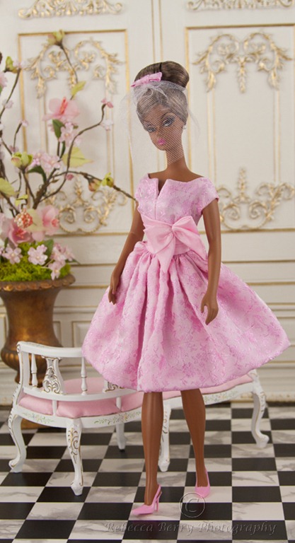 For those of us in the 1/6 OOAK clothing arena, scoring a Matisse can be a bit like winning the Lotto. She sells on her Etsy site( info below) and if you happen to be at the right place at the right time ( i.e. online when one of her notices hits your inbox that she has something new on her Etsy site), you may be lucky enough to get one. Her work is truly beautiful. The attention to detail is superb and the accessories never disappoint. I only have a few of her pieces and I treasure each and every one. I even managed to snag not one but two pink little works of art by her and I was waiting for Ms. Evening Gown to make her way here to model them. Now that I have shown you Evening Gown in her original Robert Best couture, I hope you will enjoy her in one of Matisse’s pink confections.