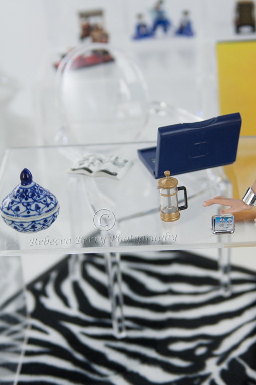 I am in no way advocating the show “Gallery Girls” here. I saw a little bit of it and was…well…not impressed. The name rather comes from my idea when I redressed the newly released “The Happening” Poppy Parker in Mattel’s Tim Gun separates. I dressed her in the crisp white shirt and black skirt with glasses and thought she looked like some hip art gallery dealer. The diorama just kind of filled in after that. Hope you enjoy!