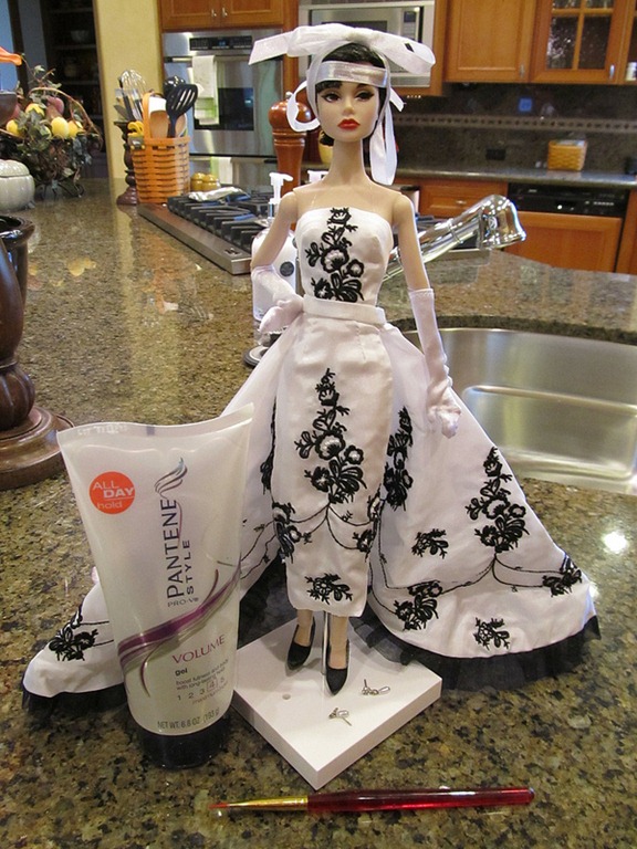 Isn’t it romantic has some hair issues so she needs a few adjustments before her photos. Thought I would share what I do for “hair adjustments”. I like to have bangs lie flat against the head and not floating off the forehead so I slather it with gel and “train” it down with some ribbons. This is a picture of what I mean
