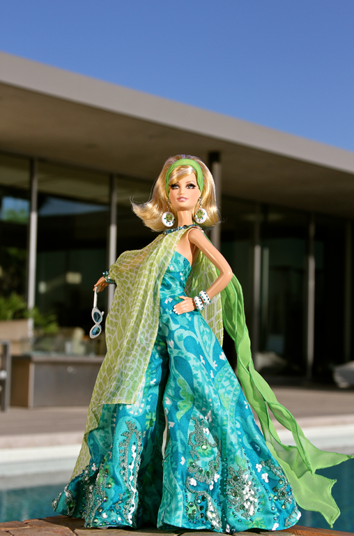 The ultimate Palm Springs girl, PS… I Love You, Barbie® is in a 60’s inspired strapless patio-pant lounger with a citron animal-print caftan. The neck of the caftan and hem of the patio pants are encrusted with gems and jewels.