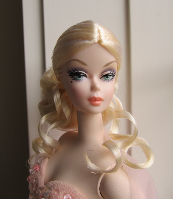 I also reported back in September that Robert Best had stated a “platinum” Silkstone was in the works for 2013 (https://insidethefashiondollstudio.com/2012/09/21/new-silkstone-info-for-2013/). And…here she is. It would appear he meant platinum HAIRED not EDITION. Thanks for the word play Robert ! I think he just wanted to see us all frothing at the mouth at the idea of a platinum edition( no more than 1,000 produced) Silkstone. To be completely honest, I am thrilled there won’t be a platinum edition Silkstone. It means I don’t have to get into the mud pit to get one…fun as it would have been { Rebecca’s arched eyebrow is raised with extreme sarcasm}. I could not be happier with this platinum haired lovely. She is on my “must buy” list.
