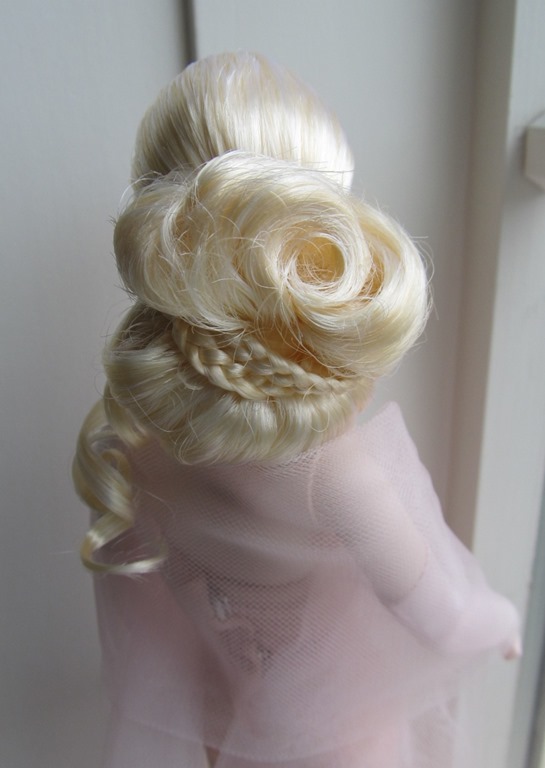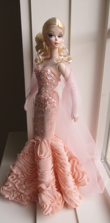 Her gown is the softest crepe de chine in a dusty pink. Her skin tone is “Silkstone peace” which means she is very, very pale. I am not sure what the back of her hairdo was “supposed” to look like but I had to do some reconstructive surgery to get mine to look something other than a hot mess. It wasn’t difficult but it did take some work and some hair gel….just sayin’.